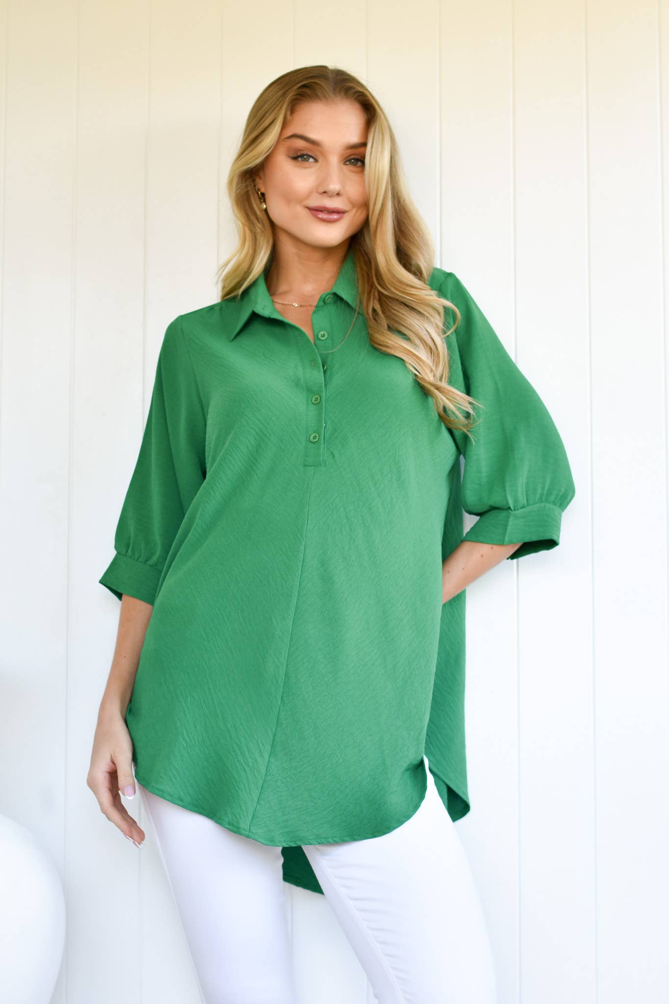 BEAUTIFUL GREEN DRAPE BUTTON UP FRONT FLOWY AND LUXURIOUS COLLARED SHIRT